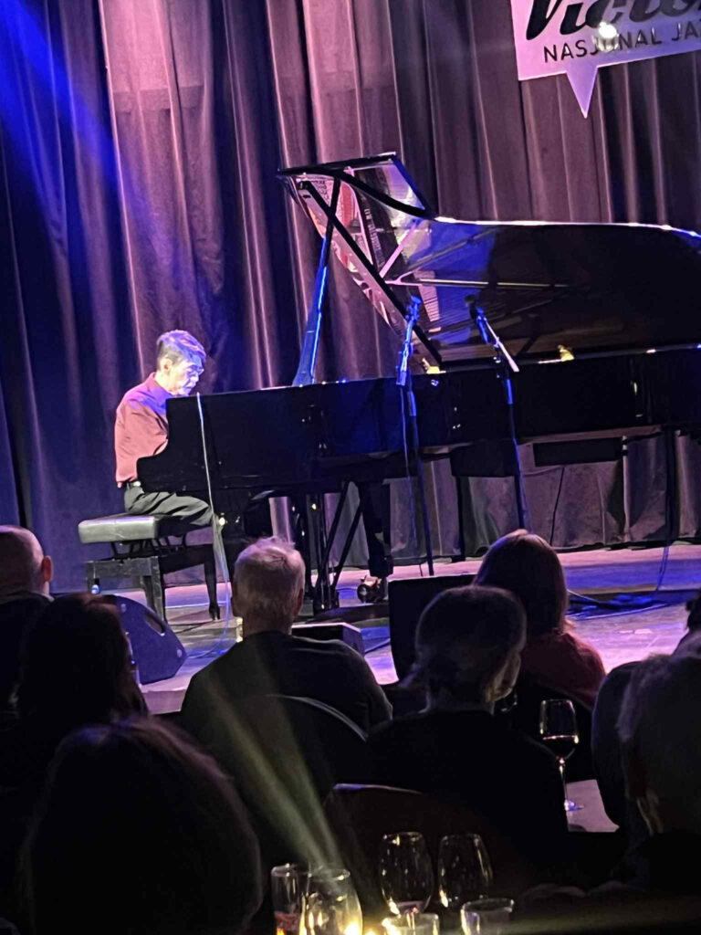 Pianist Olga Konkova har skjønt konseptet «stående applaus». Om du virkelig mener at en konsert er så god at du kan stå for det, så reis deg opp med en gang – ikke lid deg gjennom ritualet med å sitte i 20-30 sekunder før du så knirker deg opp i vertikalen, nei, sprett rett opp og bli der, selv om du blir stående alene! Mellom det første og det andre ekstranummeret til Fred Hersch (henholdvsis «And so it goes» av Billy Joel og «Blue Monk» av Thelonious Monk) snudde hun seg og forsøkte å veive med seg resten av salen. Det var ikke alle som ble med på det, men jeg sto i hvert fall. Konserten med Hersch var litt sånn jeg ofte håper at møter med amerikanske mestere skal være – musikk som er dypt innvevd i jazzens kjerne, og som viser hvor stort uttrykksmangfold som finnes der. Hersch spiller låta – improvisasjonene hans svinger aldri ut i det generelle eller umotiverte, men de skifter stadig perspektiv på låtas innmat, gjennom reharmoniseringer, ulike vamp og kontrapunktiske partier. De er morsomme, og springende – noen ganger kan jeg føle at (piano)solister havner inn i et mønster der hver eneste veiv liksom må spilles helt ut, at du skal knytte en sløyfe på hvert eneste poeng. Men hos Hersch får du både utrop, setninger, avsnitt og hele fortellinger. Det er et luntende sug i spillet hans, tempoet bølger opp og ned, noen ganger slukes et slag, og eneren strøs ut et annet sted, andre ganger stopper han og tverrvender. Det ble tre ekstranumre denne kvelden – han avsluttet med en fantastisk versjon av selve låta, «Round about Midnight», kanskje for å sette et definitivt punktum, for hva skal man spille etter den. Så tasset den lille amerikaneren med det smale, eiendommelige ansiktet av scenen, og bare noen sekunder etter luntet han pokker meg ut i salen på Victoria, stilte seg ved baren og møtte kollegiumet sitt. Denne kvelden var jo et pianomøte, ikke bare Konkova, tidlig i konserten hørte jeg også et begeistret lite johooo fra Kjetil Mulelid, og her var også Arthur Kay Piene, Ayumi Tanaka, Jørn Øien, Liv Andrea Hauge og Espen Eriksen. Det var mye å prate om – hilsener skulle utveksles, Steinway versus Bösendorfer skulle veies opp og ikke minst måtte de prate om Billy Joel, som Hersch elsker dypt, og den fremdeles ferske dokumentarserien om ham.