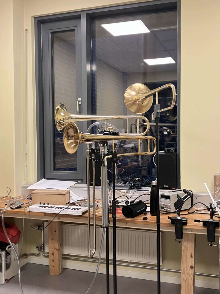 Alle trombonene jeg har brukt er forskjellige, og det har jeg vært ganske sur på i det siste. Ideen min var at jeg bare skulle bruke kasserte instrumenter, ting som er blitt liggende på korpsrom rundt omkring. Det er jo kjempefine ting ofte – jeg fikk tak i ganske mye. Men så manglet jeg de bra ventilene, så jeg kjøpte også to tromboner som var nye. Den ene ble litt ødelagt også, i frakten. Men hadde jeg bare kjøpt seks stykker av den ene nye jeg har som er i orden, så hadde jeg vært ferdig med å 3d-printe ting for en uke siden – jeg må lage unike ting, og det tar livet av meg. Så den CO2-en som vi har spart på å ikke bestille seks like fra Kina, har jeg nok sluppet ut i pur frustrasjon. Men det er fint at de får en personlighet, om alle er like mister du noe. Samtidig – om de er for forskjellige, ser det kanskje veldig steampunk ut. Det er mange fallgruver her – tiden vil vise om jeg har unngått dem.