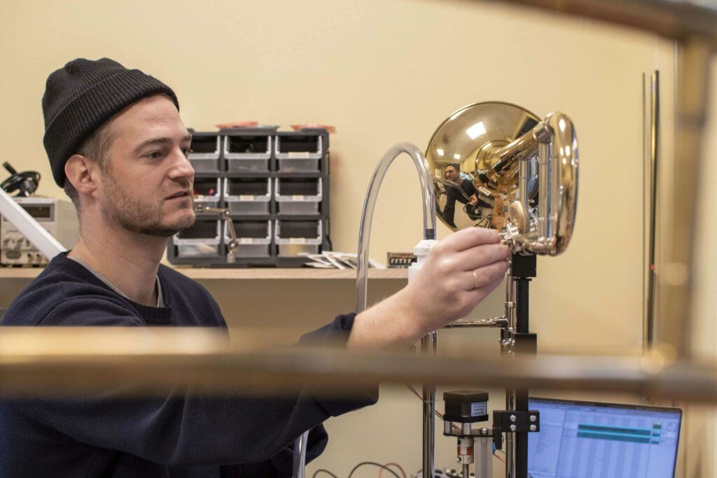 Jeg hadde skrevet til alle forskere som holder på med messing og kunstneriske lepper – og det var to som svarte, Vincent og kollegaen hans, som sitter rett ved siden av ham! Vincent var sykt raus, og sendte både over forskningsartikkelen og 3D-filen sånn at jeg kunne printe selv. Men dette var jo for trompet. Jeg måtte redesigne alt sammen og fikk hjelp til det av Louis Bindernagel, en designer i Berlin. Plutselig hadde jeg modeller for tuba, trombone og trompet, som var billige å produsere. Da fikk jeg superkick – fy faen, nå skjer det, nå blir det mekanisk messing!
