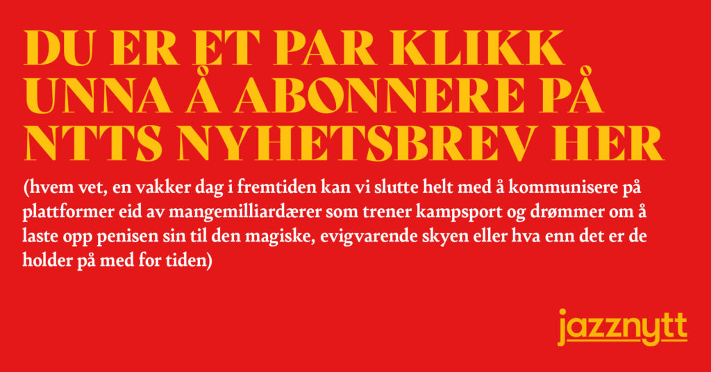 Vi går videre! Now’s The Time er en gratis ukentlig musikkavis. Vil du hjelpe oss i arbeidet, er vi glade for om du sprer ordet, eller simpelthen diskuterer noe av innholdet, og går på en og annen konsert. Vi er også glade for alle som melder seg på nyhetsbrevet vårt, som sørger for at hver eneste utgave kommer rett ned i din digitale postkasse på fredagene. Den tjenesten kan du melde deg på her. Om du virkelig vil utgjøre en forskjell og bli det vi kaller en pluss-leser av NTT, anbefaler vi å tegne et Jazznytt-abonnement. Og om du savner at vi skriver om en konsert eller en festival eller et album eller et tema, eller om du bare har lyst til å gi oss refs eller ros, har vi epost. Du kan for eksempel fyre av en mail til filip.roshauw@gmail.com.