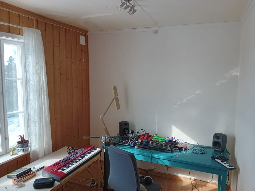 – Ja, sant, å bli berørt av noe. Det er kult at du synes det. Det er veldig morsomt å blande lyder, jeg har lenge vært interessert i kombinasjonen av akustiske og elektroniske. Å ta opp lo fi-feltopptak, som har en veldig nær følelse, og benytte seg av det i andre sammenhenger. Det var også en praktisk følge av måten jeg lagde den her musikken på. Jeg hadde et arbeidsopphold i Folldal kommune i mars 2024. Da satt jeg alene og lagde demoer til plata. Jeg hadde ikke tilgang på de andre musikerne, de kom litt seinere inn i prosessen. Det tror jeg også åpna for mye av det man hører – jeg bare lagde ting og testa det ut. Flere av de spontane ideene endte jeg opp med å bruke på plata.