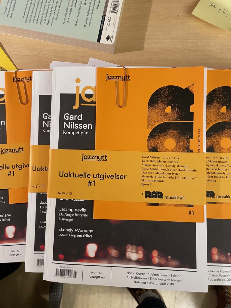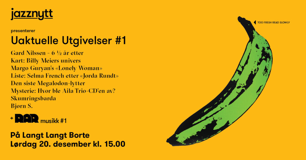 Uaktuelle Utgivelser #1 kommer ut i et begrenset opplag på en liten hyllemeter. Hvis salget går nogenlunde bra, kommer det også flere utgaver – hylla er full av muligheter – og vi kan faktisk trenge plassen. Så kom gjerne innom vår matiné-julefeiring på baren Langt Langt Borte – et koselig sted som er bitt av jazzbasillen – lørdag 20. desember klokka 15! Da feirer vi også naturligvis det nyeste Jazznytt-nummeret (det er jo ikke noe galt med det ferskeste heller) og at NTT runder 300 utgaver denne adventen.