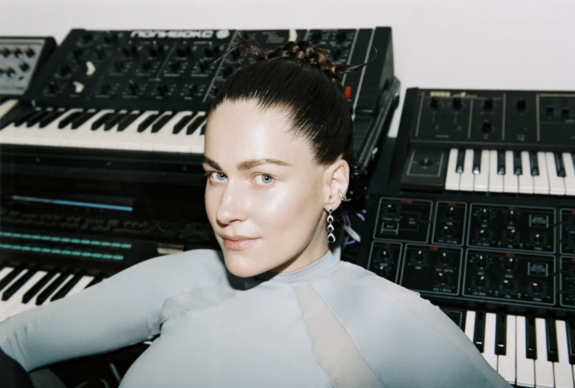 Plateaktuelle Farao, også kjent som Kari Jahnsen, fotografert foran en skokk med flotte årgangssynther. Foto: Celine Paradis