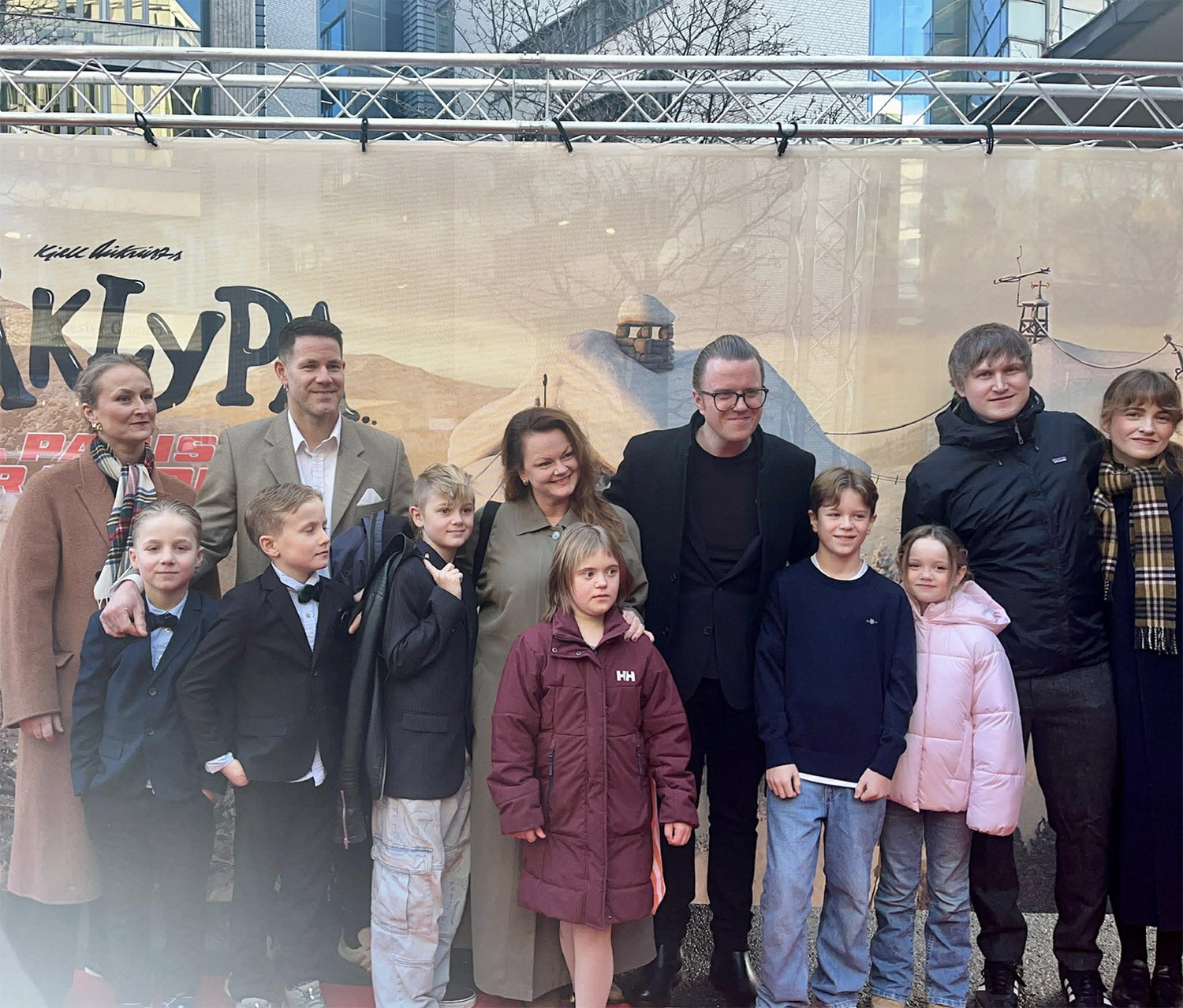 Ola Kvernberg med filmmusikk-gjengen og unger fra premieren til den nye Flåklypa-filmen.