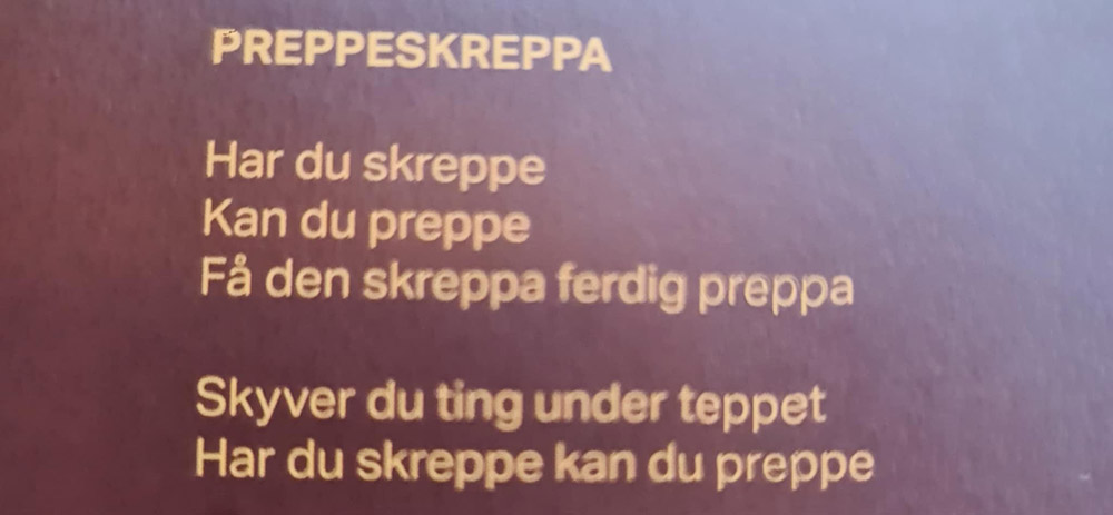 Det mest åpenbare eksemplet på hva jeg snakker om er “Preppeskreppa”; en irriterende fengende call-and-responsetrall som remser opp alskens drit man kan putte i skreppa for å preppe, altså stille forberedt dagen det skjer. Dagen hva skjer? Ikke tenk på det, her er en liste med greier det er morsomt å synge med på.