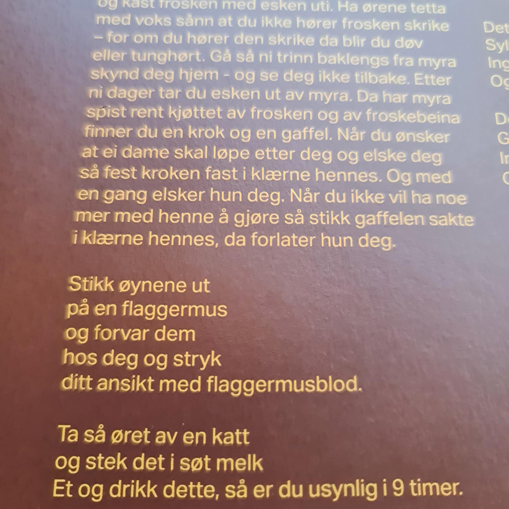 Oppramsingen står sterkt også der bandet ikke har skrevet teksten selv. I improviserte “Mersus Stalon, Metero Texto” er teksten i sin helhet hentet fra “Norske Hexeformularer og magiske opskrifter”. Her kan vi lære at det eneste som står mellom deg og alt du ønsker deg er å maltraktere, pine og drepe alskens laverestående livsformer. Levende ormer skal syes i, katteører skal klippes av, frosker skal druknes, flaggermusøyne skal stikkes ut. “Ha ørene tetta med voks så du ikke hører frosken skrike», anmodes det. Å bli konfrontert med lidelsene som skal til for å oppfylle dine ønsker er ikke sunt.
