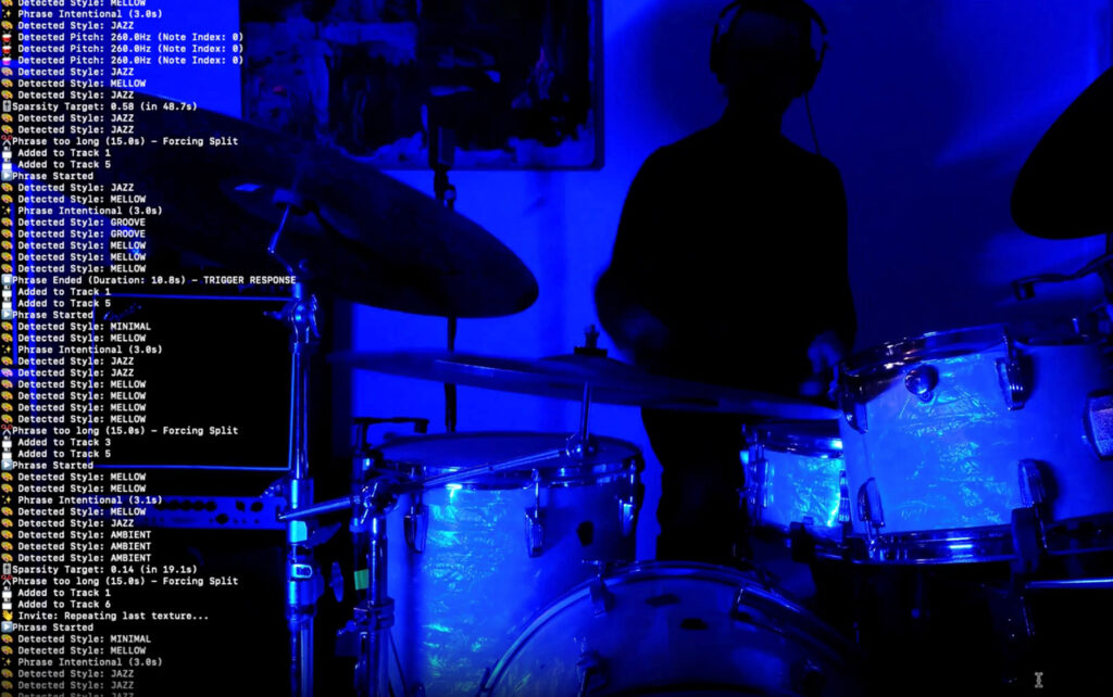 – Ja, det finnes forløpere. Forskjellen er at Voyager er et generativt. Det er satt opp et sett med regler som følges, det er ikke en dynamisk respons, den er statisk. Veldig avansert, selvsagt, men statisk, så vidt jeg kan se. Somax 2 “krever”, i hvert fall på tidspunktet da jeg lagde (is) in a river, en operatør for å holde på. Hvis noen må styre for å få noe musikalsk ut av det som foregår, betyr det slik jeg ser det at man har å gjøre med et instrument som noen spiller på. Instrumentet kan være kjempekomplekst og digitalt, basere seg på en haug av parametre – men om man er avhengig av at noen tar valg for å få frem et musikalsk resultat, er det ikke basert på maskinlæring på samme måte som scriptet mitt. Det som i mitt system ligner mest på Voyager og Somax2, er at jeg også må starte det, og at det baseres på eksisterende treningsdata. Jeg må trykke på en knapp, velge en lengde, og maskinen starter ikke før jeg lager en lyd den oppfatter. Men slutten er nesten alltid ganske abrupt. Når 10 minutter har gått er det stopp, og selv om det finnes en slags programmatisk forståelse av opp- og nedbygging, så er ting som «når spiller vi høyt?», «når avbryter vi?», og ikke minst «hvor lang bør den siste tonen være?» musikalske parametre som viser seg å være helt ekstremt vanskelig å syntetisere. Det er bevisste valg musikere tar i øyeblikket, og den typen bevissthet tviler jeg sterkt på at noen gang kommer til å kunne reproduseres av en maskin.