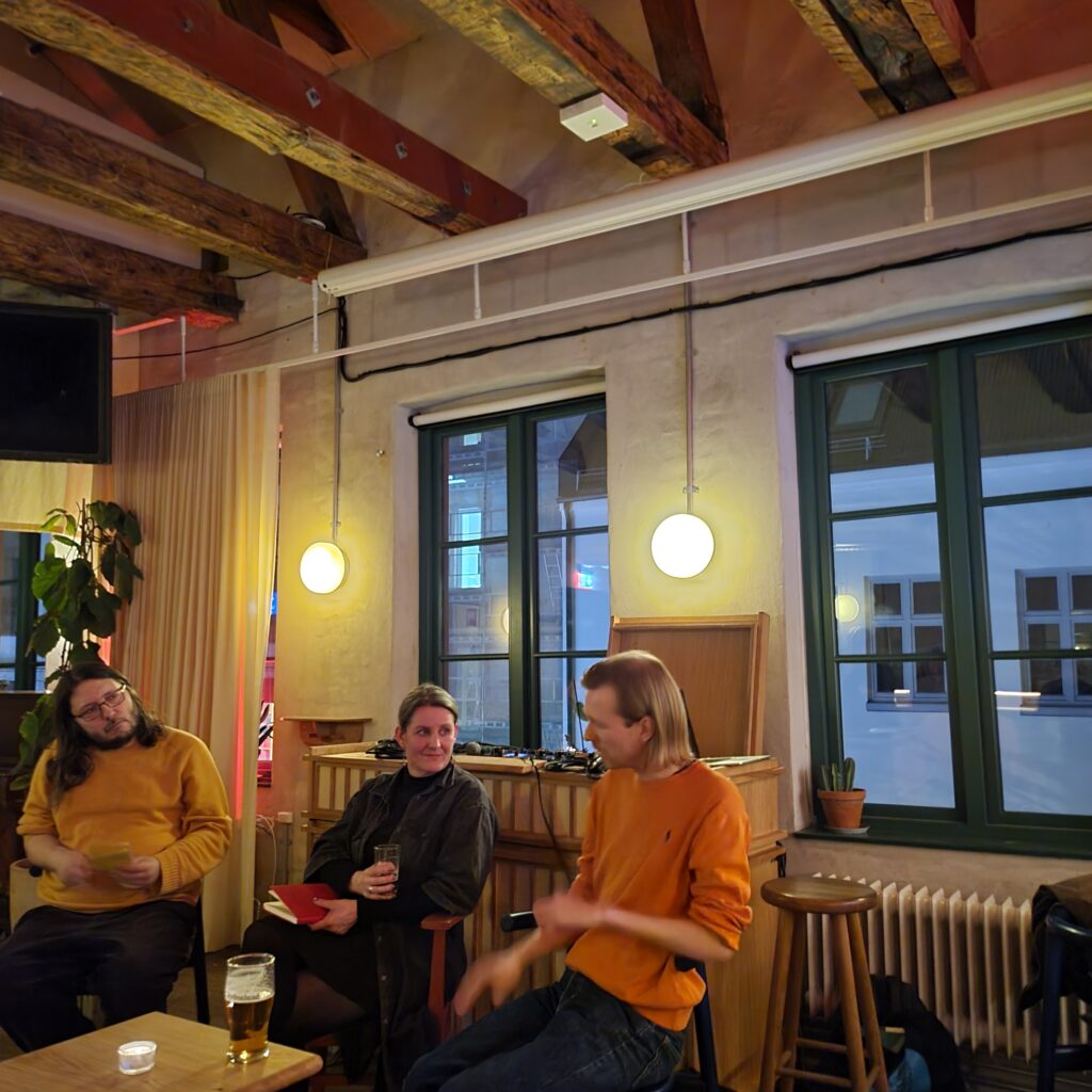 Men nå skal det handle om den forrige kvelden, som ble arrangert onsdagen før påske. Etter at både norske og internasjonale jazzartister hadde blitt oversvømmet med falske låter, var det naturlig å ta (nok) en liten prat om tekoligarkenes jerngrep rundt kulturen, generativ KI og hvordan vi gir ut musikk for tiden. Vi fikk med oss et nydelig panel: Anja Nylund Hagen er leder ved Institutt for Musikkvitenskap på Universitetet i Oslo, og har i sin forskning fordypet seg nettopp i digitalisering og plattformøkonomien. Vi har snakket med henne om den slags tidligere, i forbindelse med rapporten Digital Ambivalens. En musiker som nok har kjent en god del på nevnte ambivalens, er den originale gitaristen og ordsmeden Torstein Slåen, som de siste årene har vært en aktiv deltager i debatten om fremveksten av generative modeller, og som har engasjert seg i Kunstnerisk initiativ for regulering av kunstig intelligens – også kjent som KIKI. Samtalen ble moderert av blogghalvdel Filip. Her har Vinger tatt et bilde av panelet også: