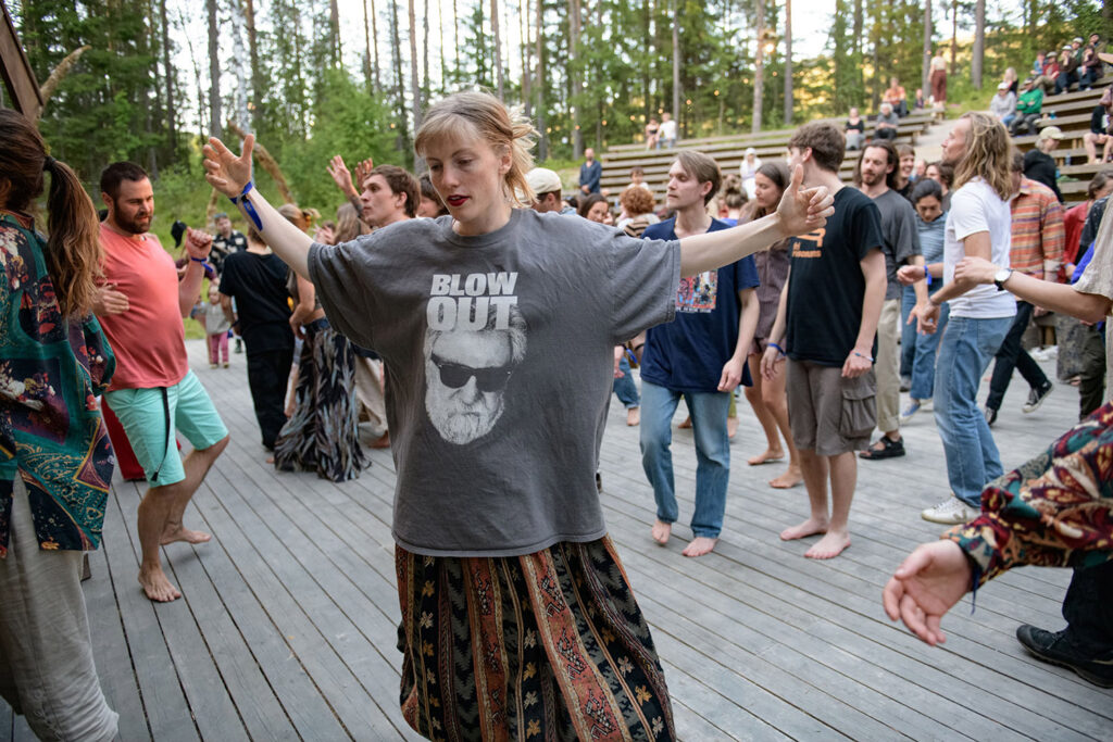 Anna Ueland med Evan Parker på skjorta, på dansegulvet under Motvind 2025, fotografert av Dawid Laskowski